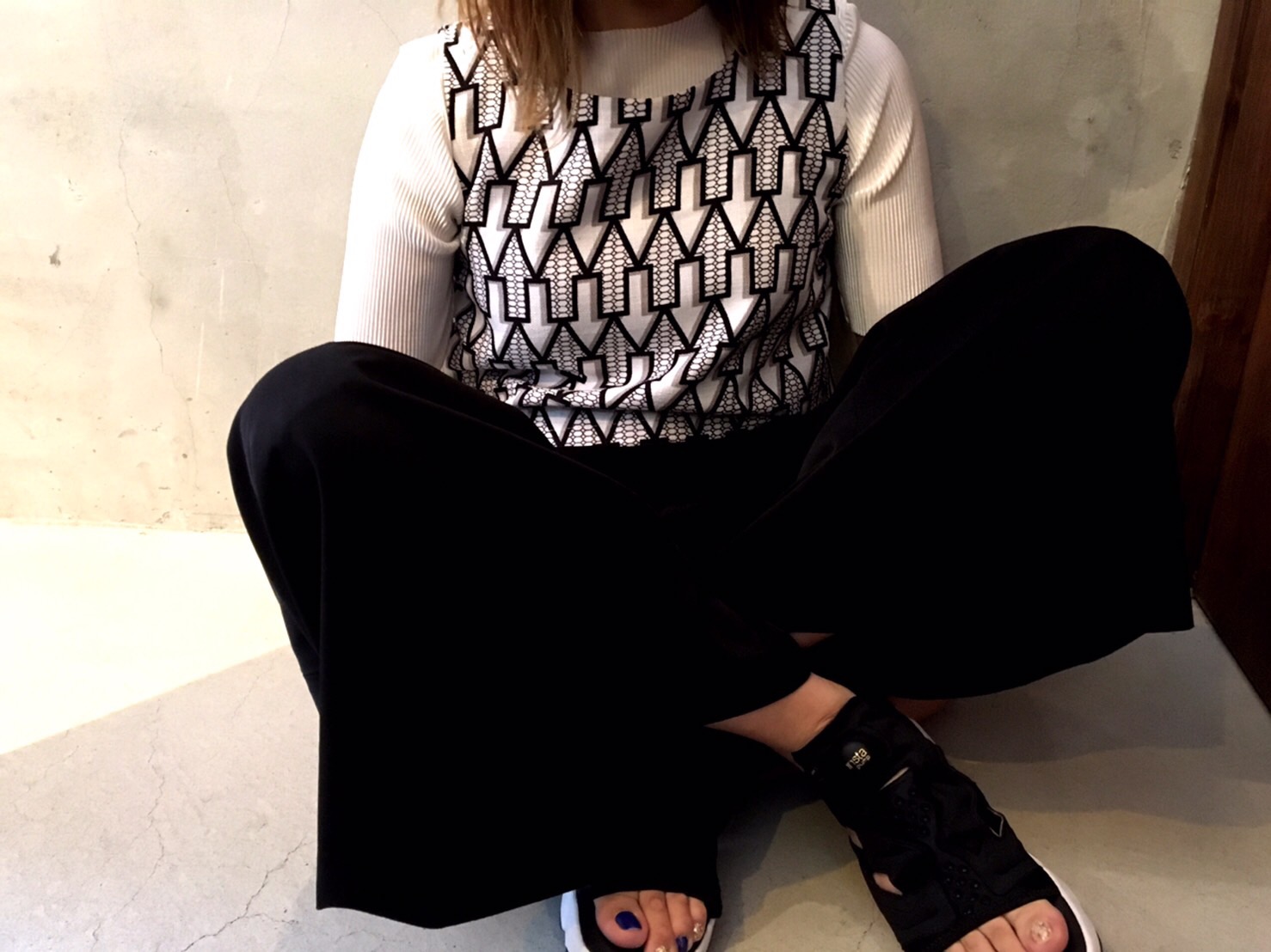 足元はサンダルで夏らしい感じが出そうですが、黒のロングパンツを合わせることで秋を意識した着こなしになります!!