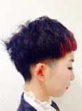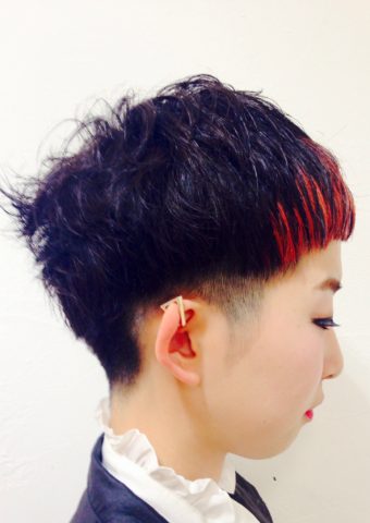 黒髪ベースのベリーショート☆ 襟足は思いっきり短くしても後頭部の丸みを強調して動きのある毛先で女の子らしさを残してあります。ポイントは、前髪にワイドにいれたオレンジレッドのカラー♡インパクト大の個性派ヘアーです♪